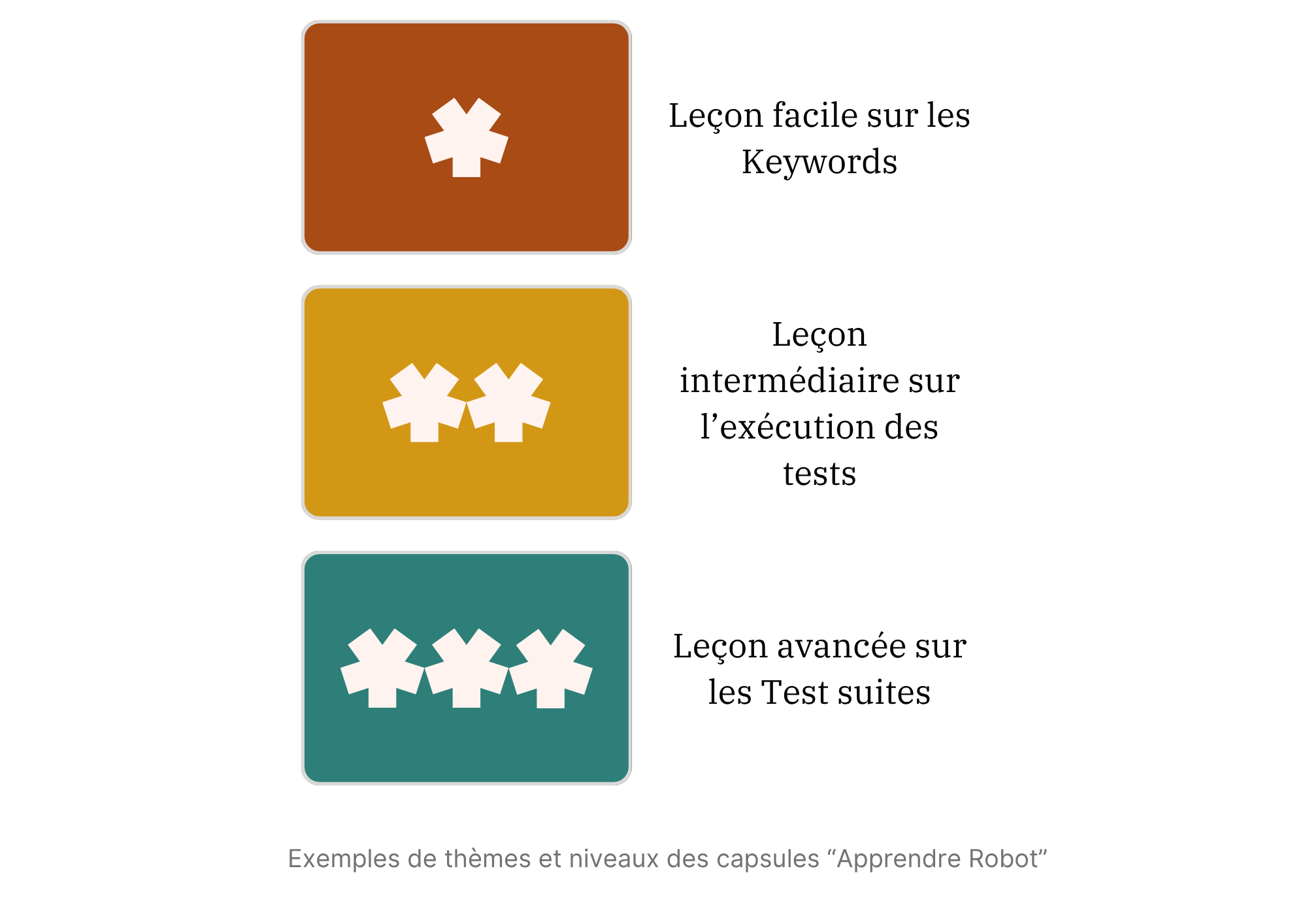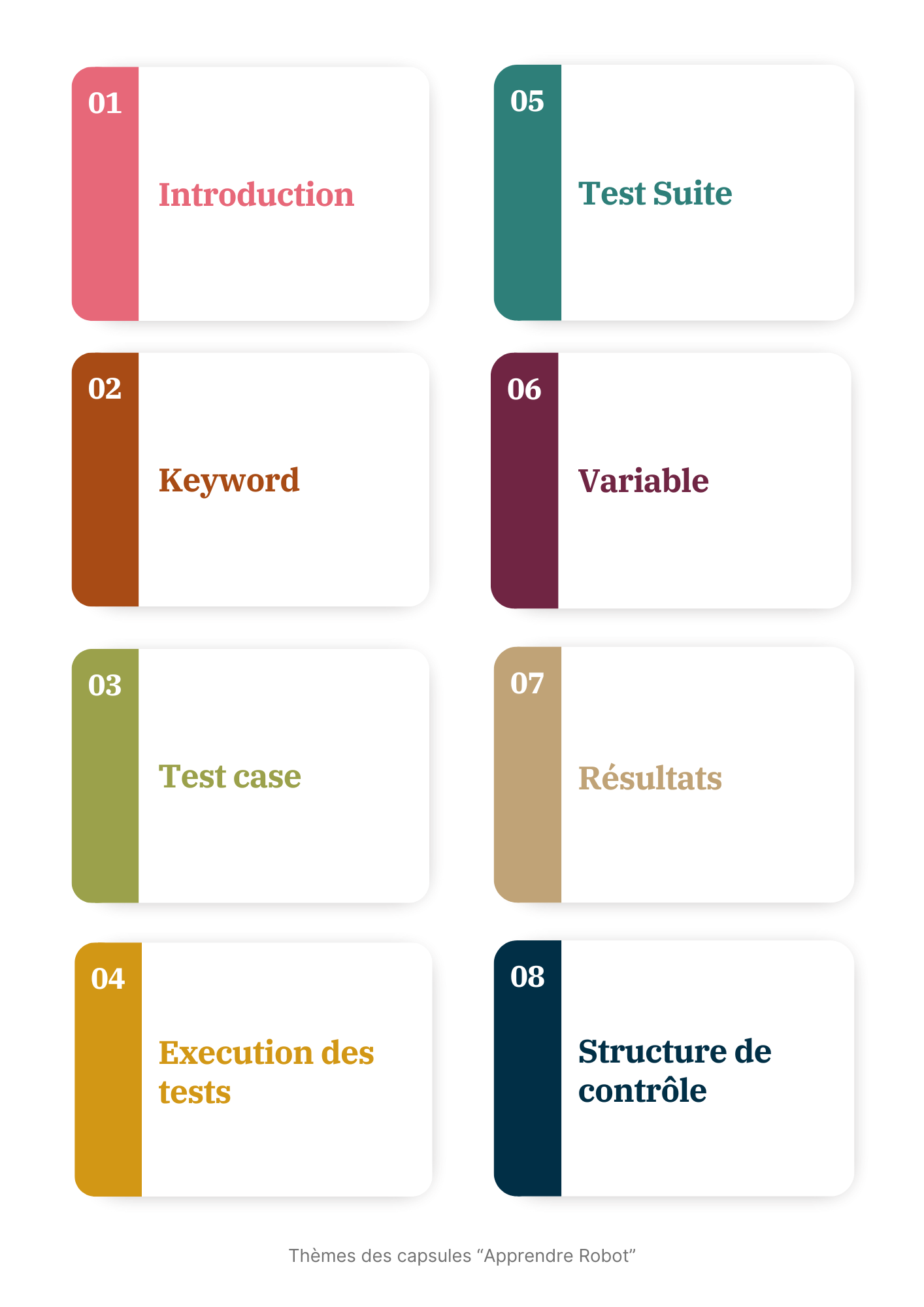 Nous avons défini pour le moment 6 thèmes associés aux capsules pour présenter Robot Framework :